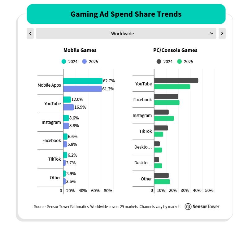值得注意的是,尽管 Epic Games 在总广告支出中仅排名第四,但《堡垒之夜》却是单款游戏广告投入最高的产品。EA 旗下的《战地 6》—— 同时也是 2025 年最畅销游戏 —— 营销支出位居第四,助力其登顶销量榜。