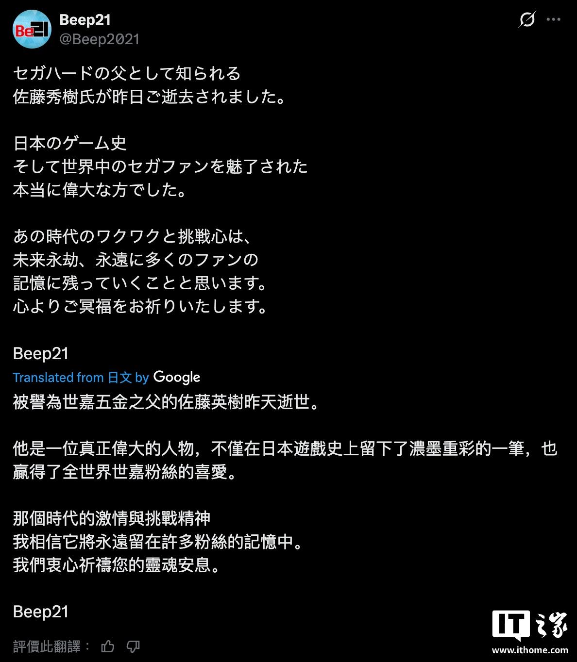 2月15日消息,据《Beep21》报道,前世嘉社长佐藤秀树于2月13日去世,享年75岁,他曾主导开发MD、土星、DC等经典游戏机。