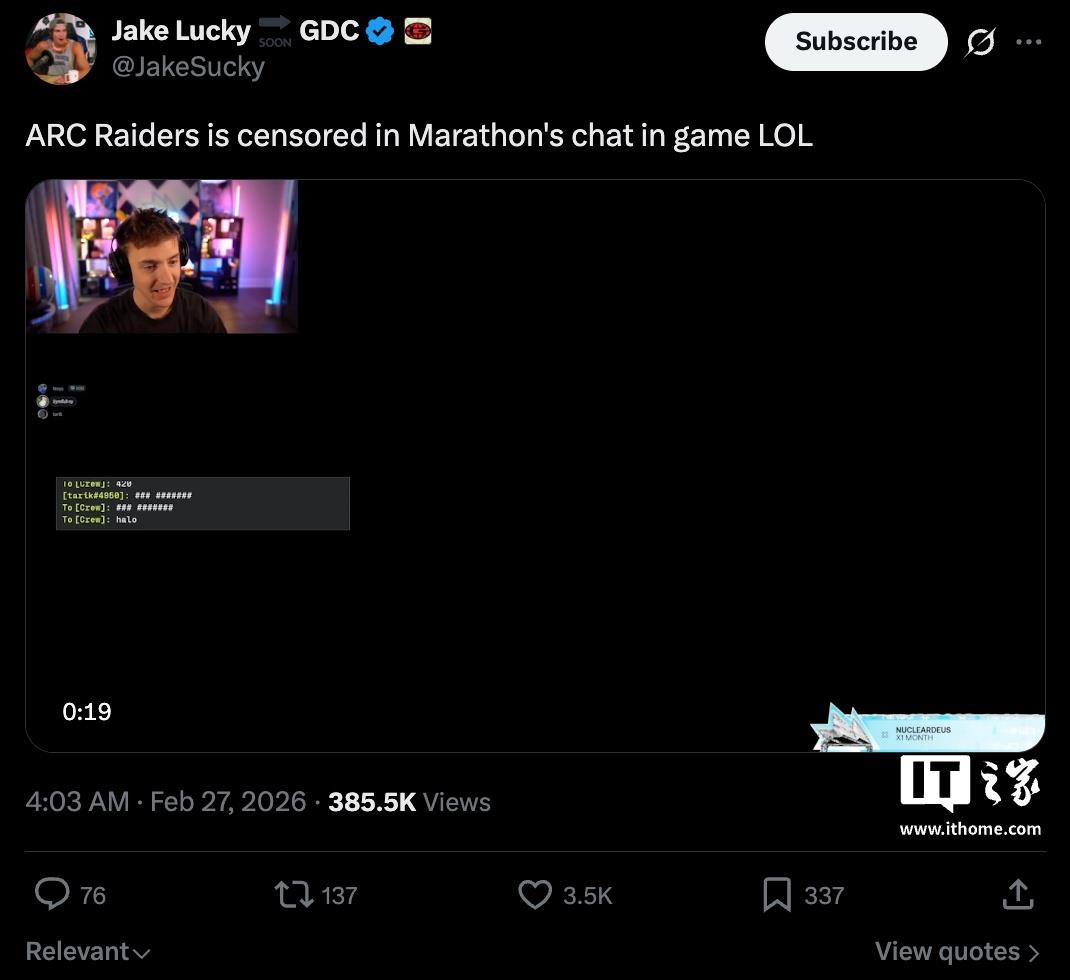 不过有玩家陆续发现游戏内聊天会屏蔽“ARC Raiders”关键词,因此引起争议。对此,Bungie 简单回应称已修复相应屏蔽词问题。
