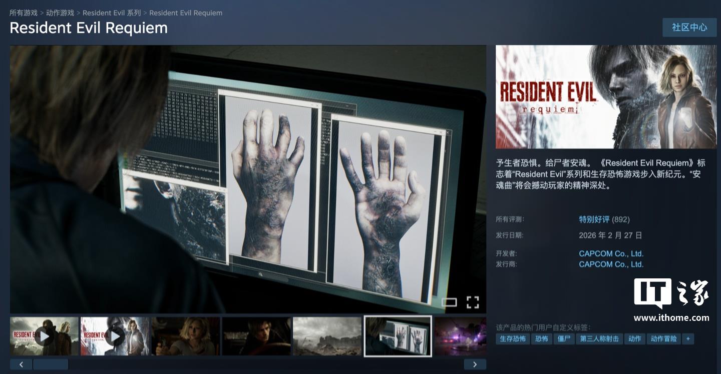 2月27日,据了解,卡普空的游戏《生化危机:安魂曲》已经上线,现在你可以在PS5、Xbox Series X|S、Switch 2以及PC上玩到它,Steam国区的起售价是348元(商品页链接在这:https://store.steampowered.com/app/3764200/Resident_Evil_Requiem/?snr=1_4_4__118)。