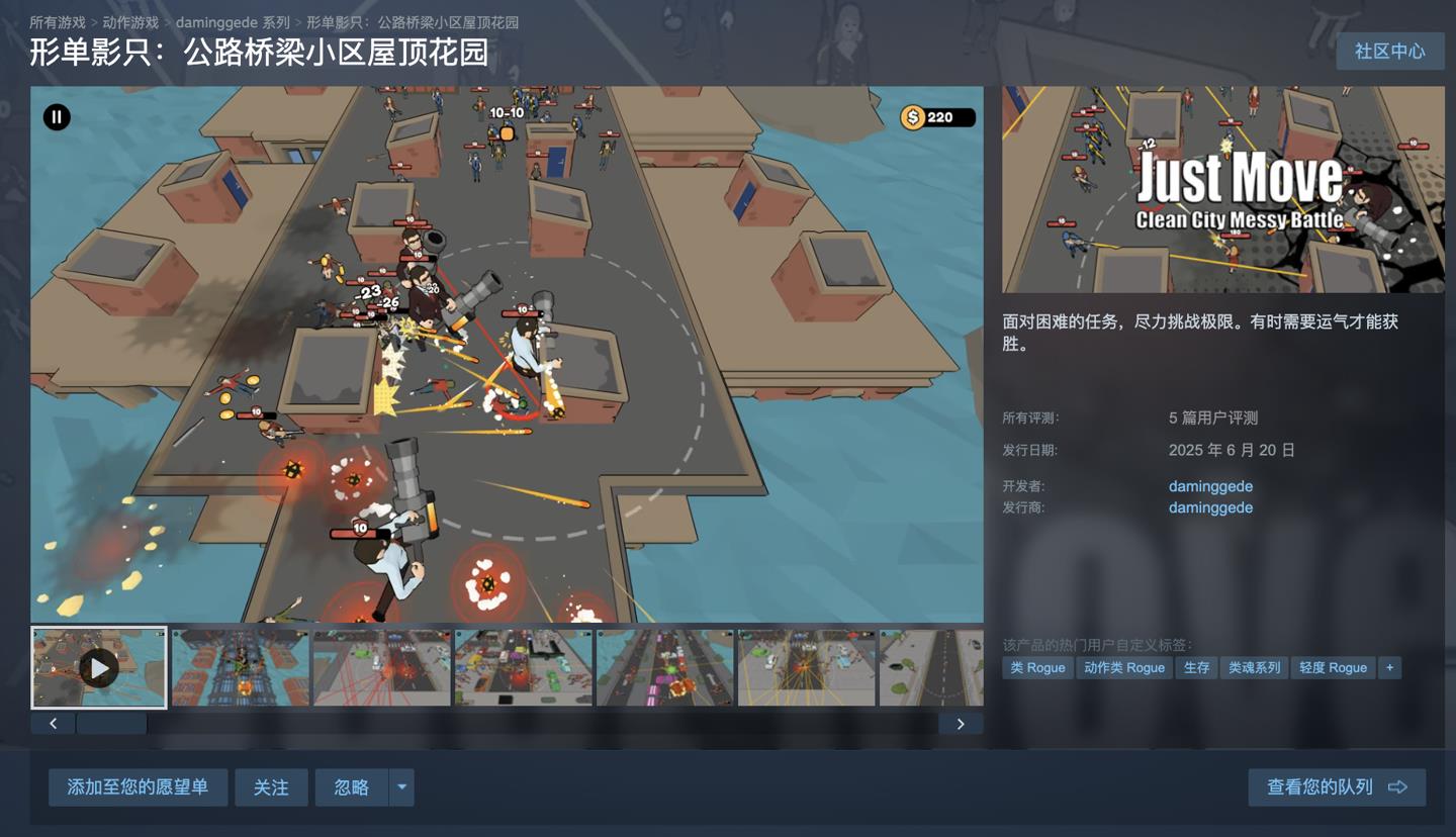 3月2日,开发者daminggede透露,《Just Move:Clean City Messy Battle》这款俯视角射击游戏在Steam上推出限时免费领取活动。原价在国区是62元,玩家能在3月5日凌晨2点之前免费获取。去Steam商店看看吧。