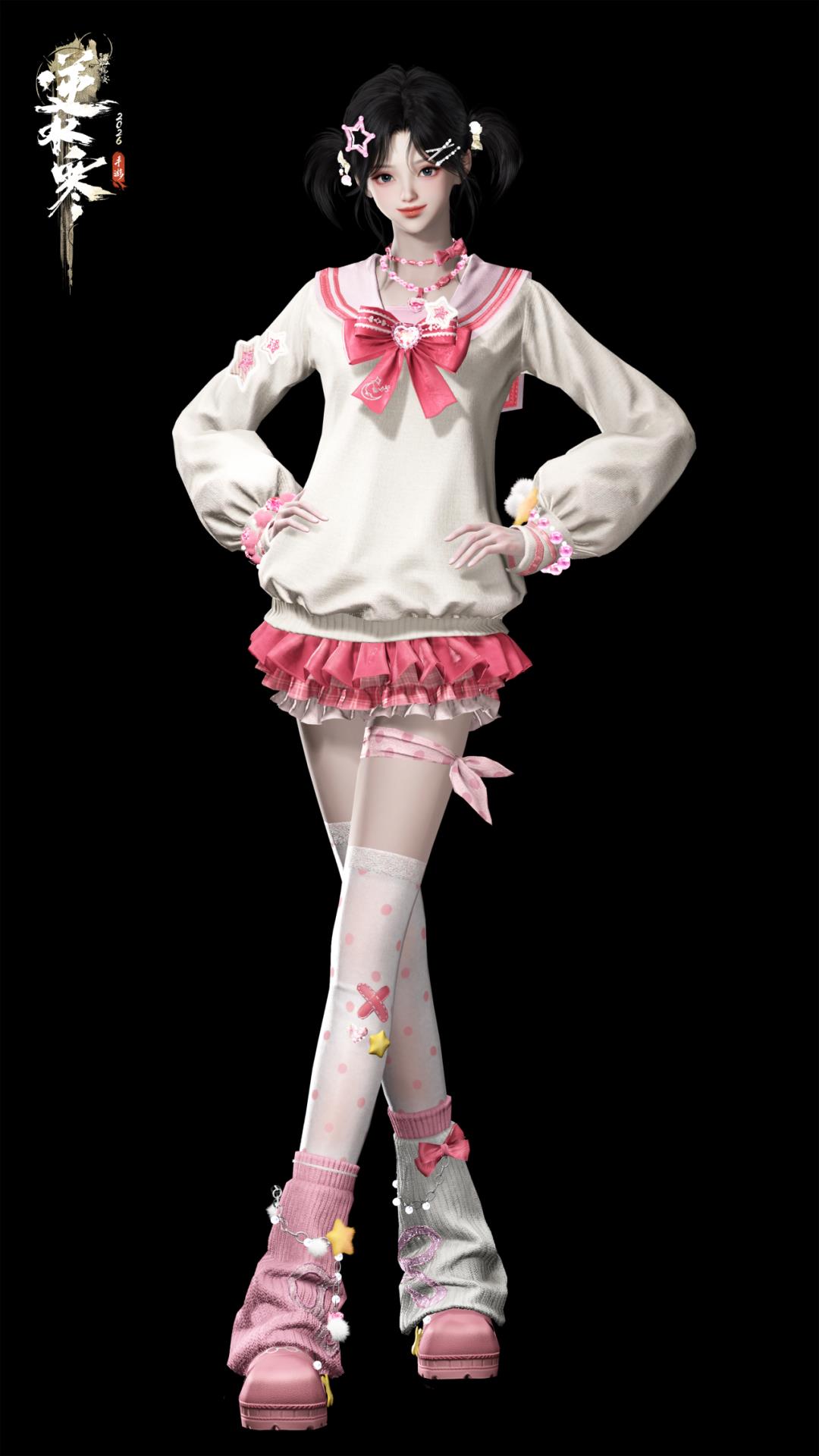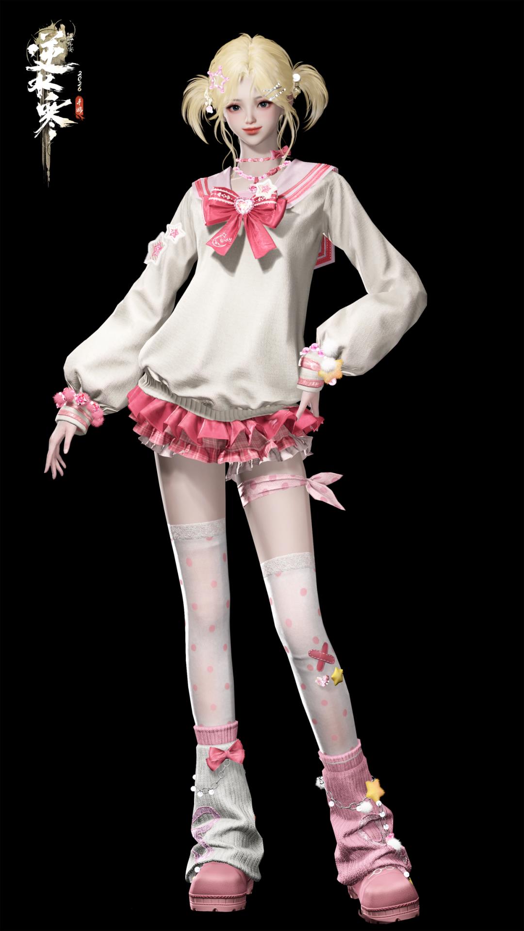 菲菲公主主题时装【菲菲甜心】以粉白撞色重现千禧年的甜心风格,短双马尾搭配金色的菲菲公主皇冠,荷叶边泡泡长袖针织衫,搭配格纹蓬蓬短裙,腰间的爱心形小猪包为整套穿搭增添独特的风格。