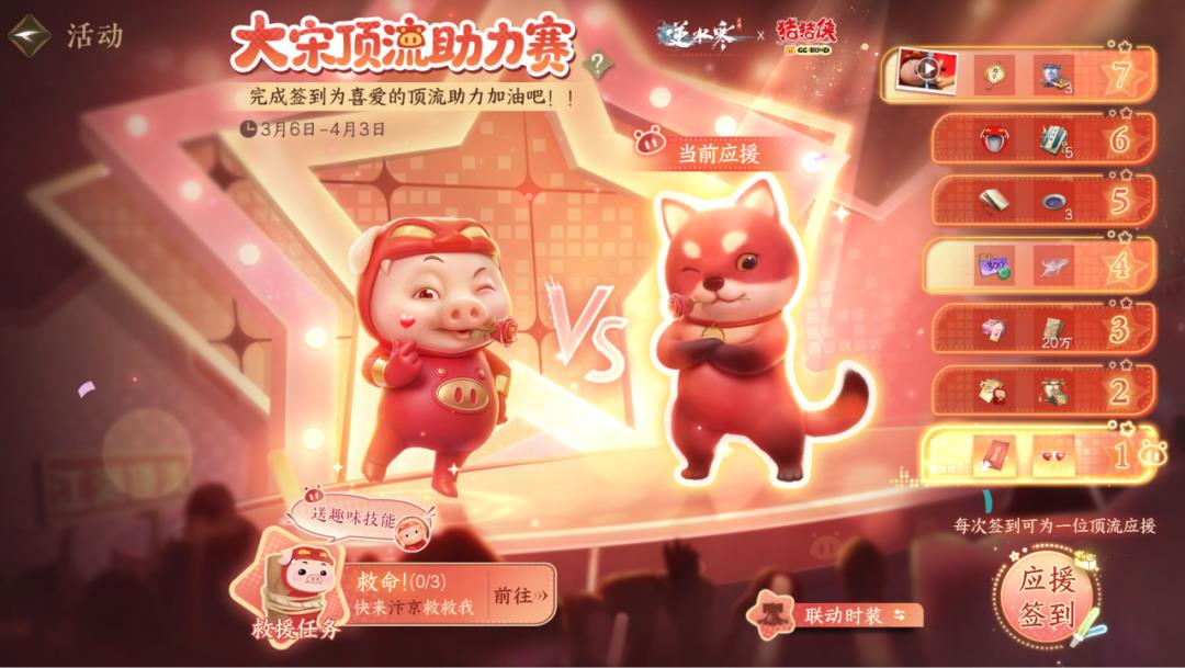 此外,3 月 6 日起,玩家参与【大宋顶流助力赛】活动,就能为血河小狗和猪猪侠应援助力,获得联动奖励。