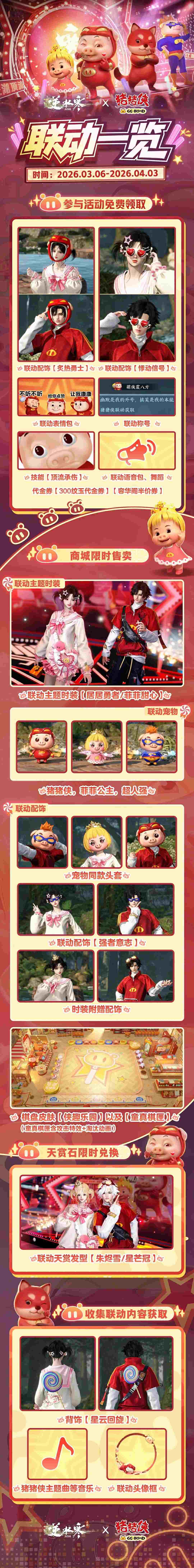 本次联动还有猪猪侠主题头像框【武林萌侠】,以及经典音乐曲目《猪猪侠》、《小英雄大肚腩》、《超级棒棒糖》等内容,附联动内容一图知如下: