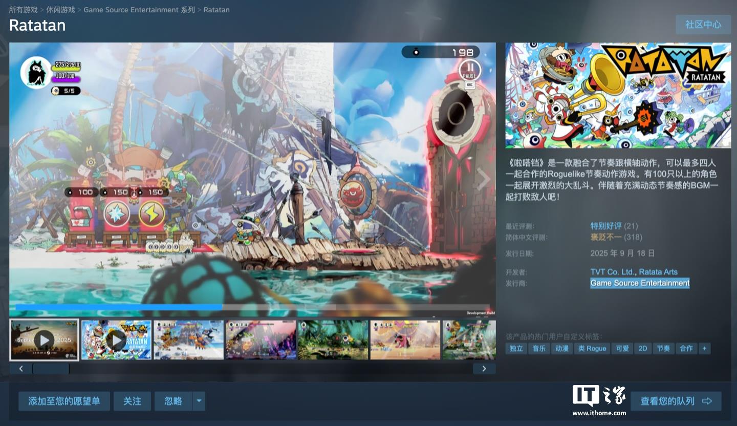 注意到,本作已于去年 9 月在 Steam 平台开启抢先体验,国区定价 92 元,截至发稿游戏好评率 85%“特别好评”,游戏商品页如下(https://store.steampowered.com/app/2949320/Ratatan/)。