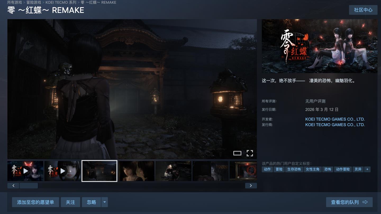 3月5日消息,早在去年9月光荣特库摩就正式公布了《零~红蝶~REMAKE~》,作为2003年发售的经典和风恐怖冒险游戏《零》系列第二代《零 ~红蝶~》的完全重制版,目前这款游戏的试玩版已经正式上线,等到3月12日就会迎来正式发售。