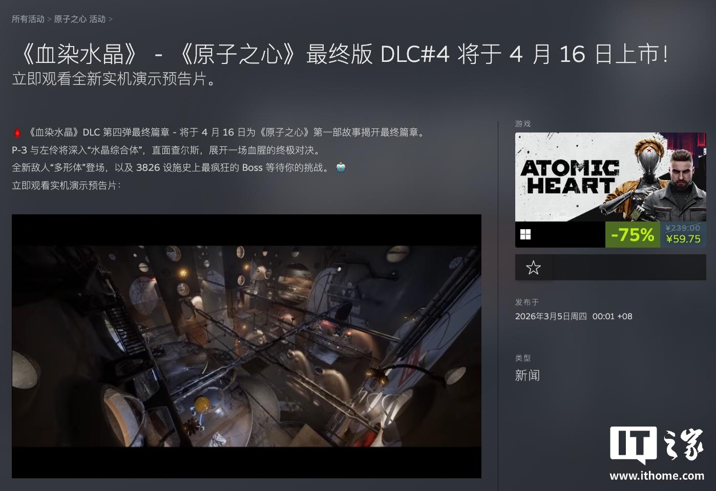据3月5日的消息,开发商Mundfish正式宣布,旗下游戏《原子之心(Atomic Heart)》的第四款大型DLC“血染水晶”已经确定会在4月16日上市,为了让玩家先睹为快,官方也同步放出了这款DLC的实机预告。