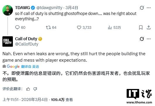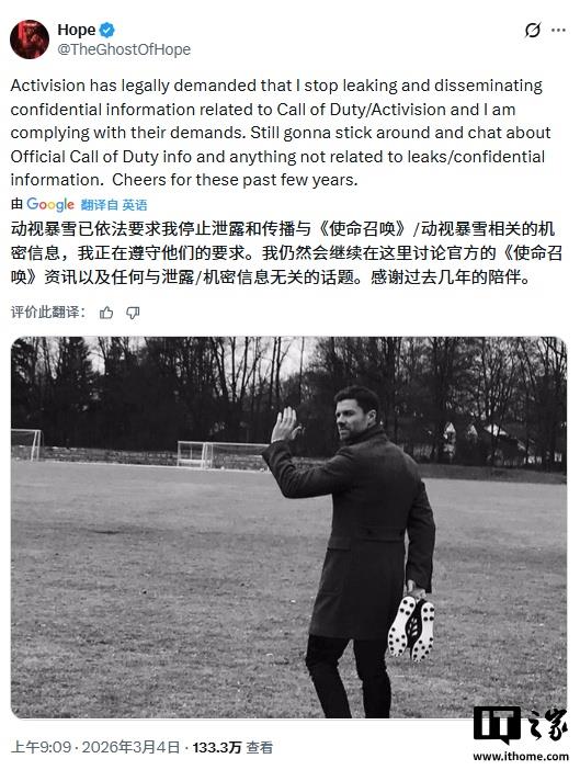 注意到,Hope 表示:“我仍会留在社区,聊聊《使命召唤》的官方消息,以及一切与爆料 / 机密无关的内容。感谢过去几年大家的支持。”