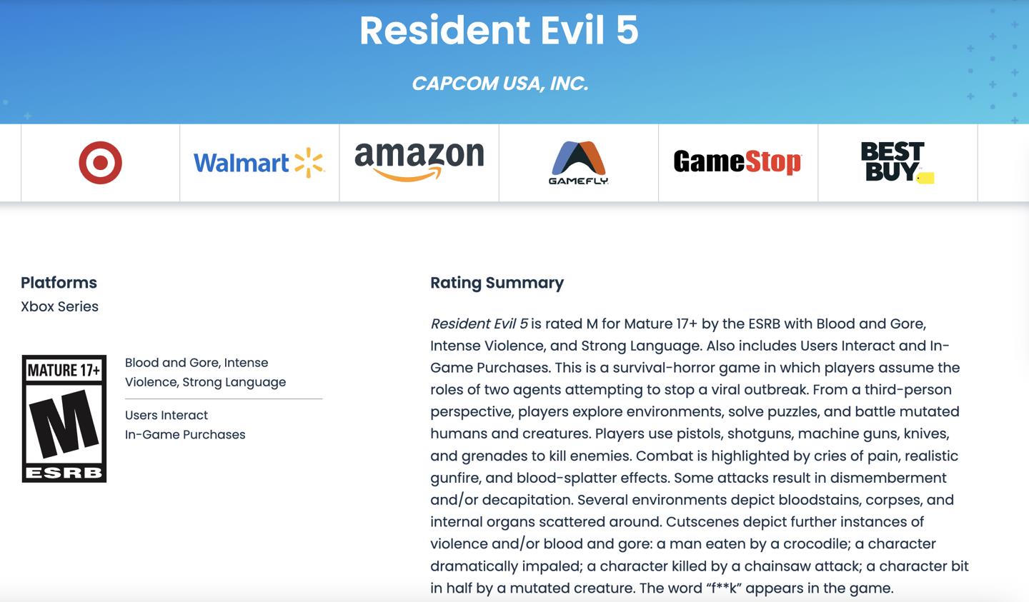 2月10日,据游戏媒体Kotaku报道,卡普空的《生化危机 5》Xbox Series版最近在美国的娱乐软件分级委员会ESRB官网上发现了。大家不妨期待这款重制版在近期亮相。