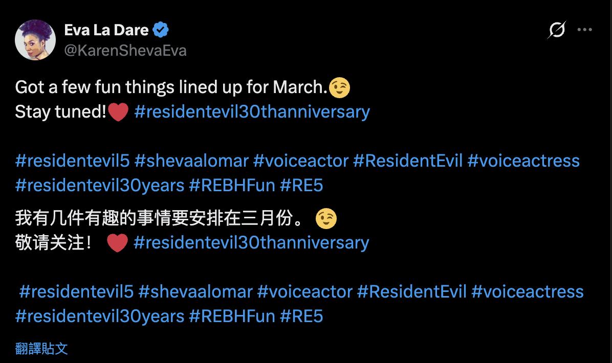 此外,《生化危机 5》谢娃 · 阿洛玛的配音演员 Eva La Dare 上个月在 X 平台发文称:“三月将有一些有趣的事情要发生,敬请期待!”,并在贴文中附上了“#RE5”“#resident evil5”(生化危机 5)标签。