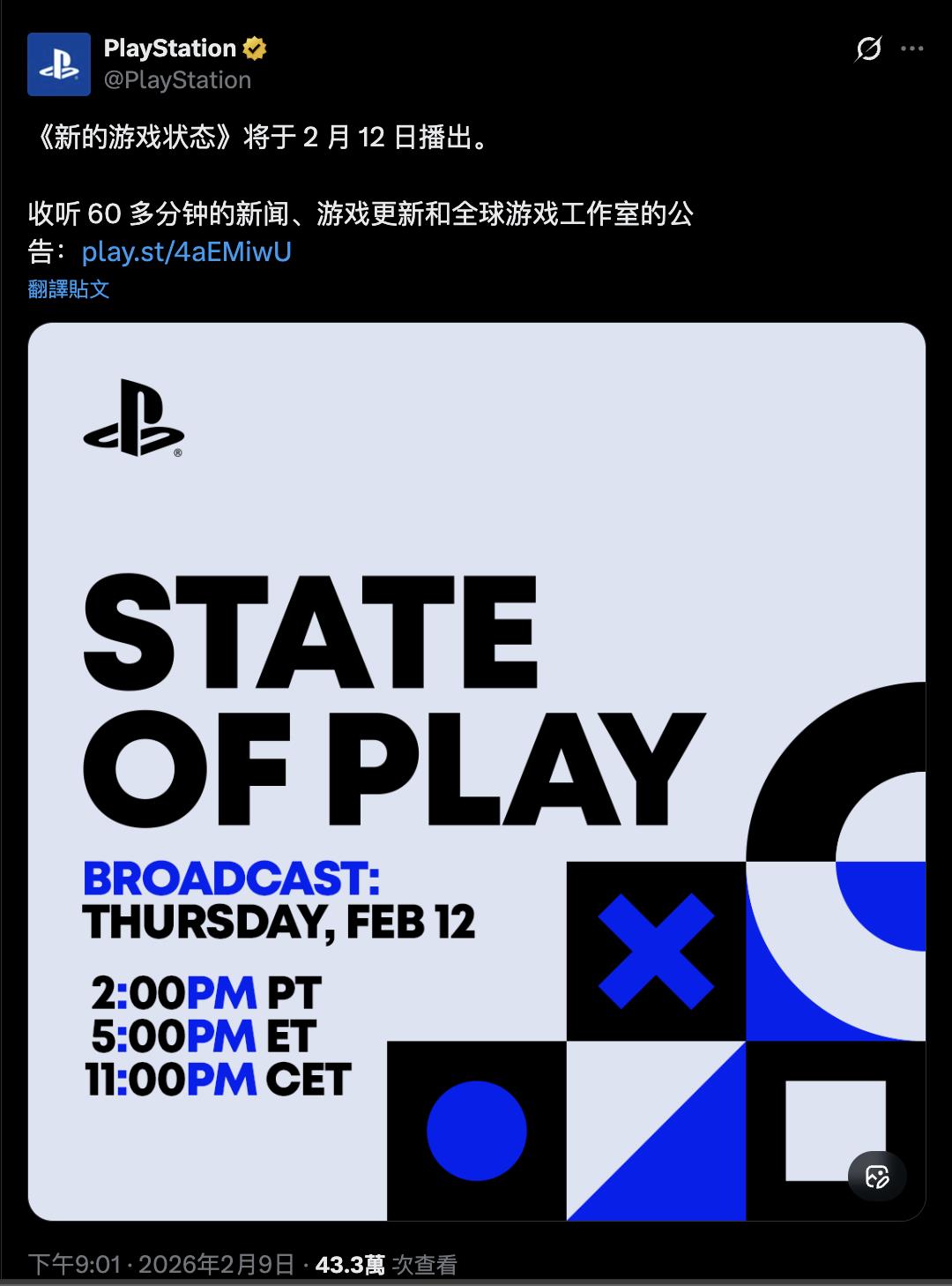 2月9日消息,索尼在X平台宣布,新一期 State of Play发布会定于日本时间2月13日上午7点(北京时间上午6点)举行,届时将发布旗下工作室及游戏的最新动态。