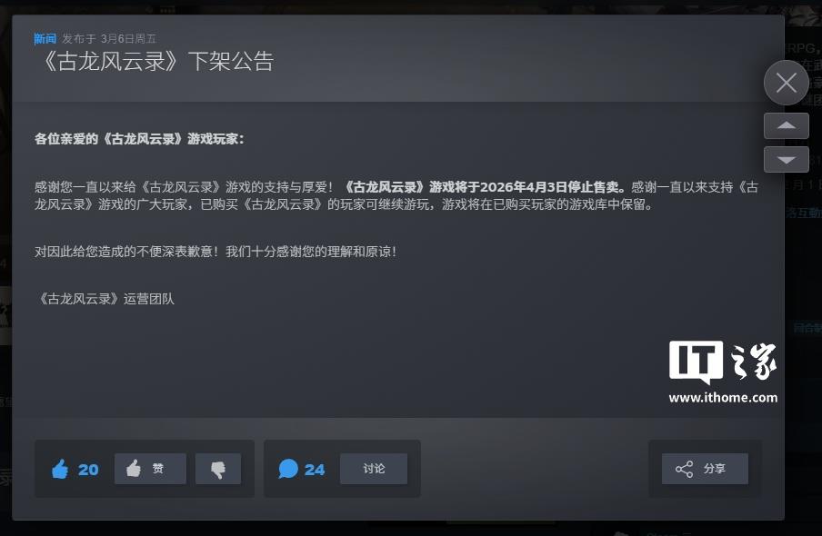 3月6日消息,河洛工作室开发的武侠RPG《古龙风云录》发布公告,宣布将于4月3日在Steam停售,已购买的玩家不受影响,可继续畅玩。