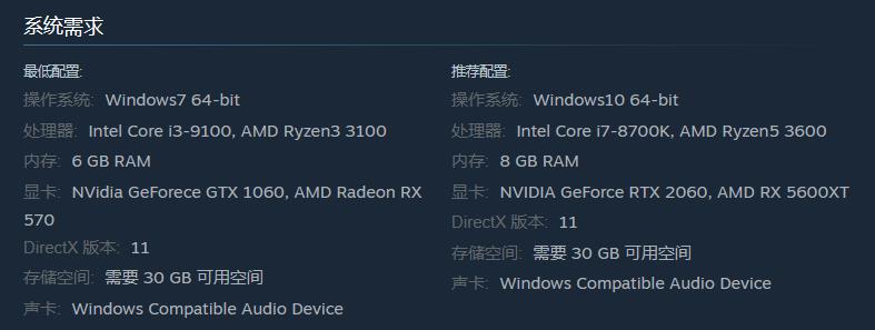 查询配置发现,这款游戏最低需要 Windows7 64-bit 操作系统、英特尔酷睿 i3-9100 / AMD 锐龙 3 3100 处理器、英伟达 GeForece GTX 1060 / AMD Radeon RX 570 显卡,以及 30GB 存储空间。