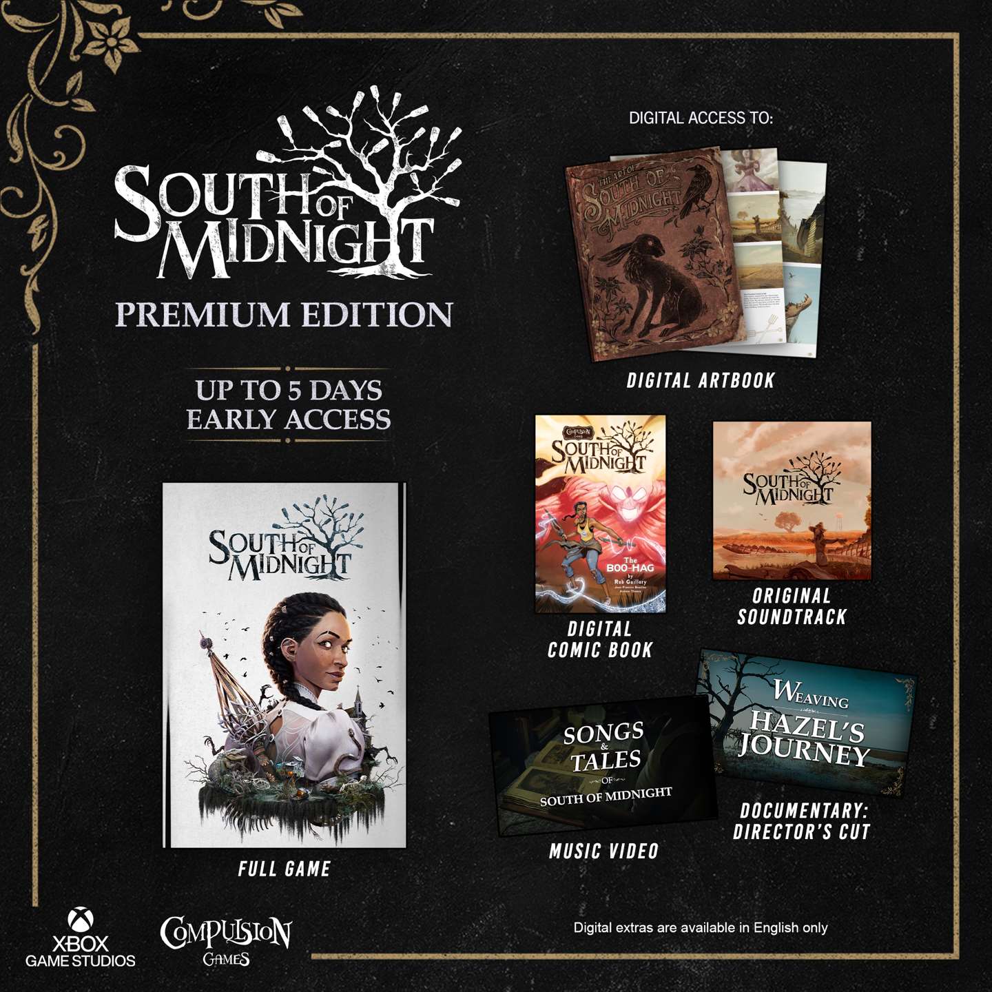 除了游戏本体之外,《午夜之南》高级版还附带一本数字艺术画册、一本数字漫画书、游戏原声音乐(数字版)、一段音乐视频以及一部关于该游戏的纪录片。