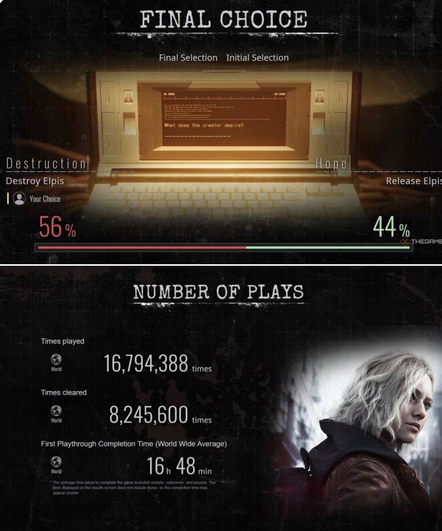 数据显示,有 56% 玩家初次通关时看到里昂领盒饭,剩下的 44% 玩家选择释放 Elpis 并治愈里昂。不过大多数人看到滚动字幕结束后询问是否“再试一次”时才意识到选错了结局,并且卡普空显然也不可能让他们的明星角色那么快死掉。希望我们未来能够看到 70 岁的里昂继续回旋踢飞僵尸,一路打到老。