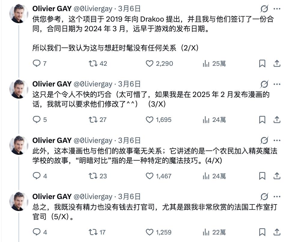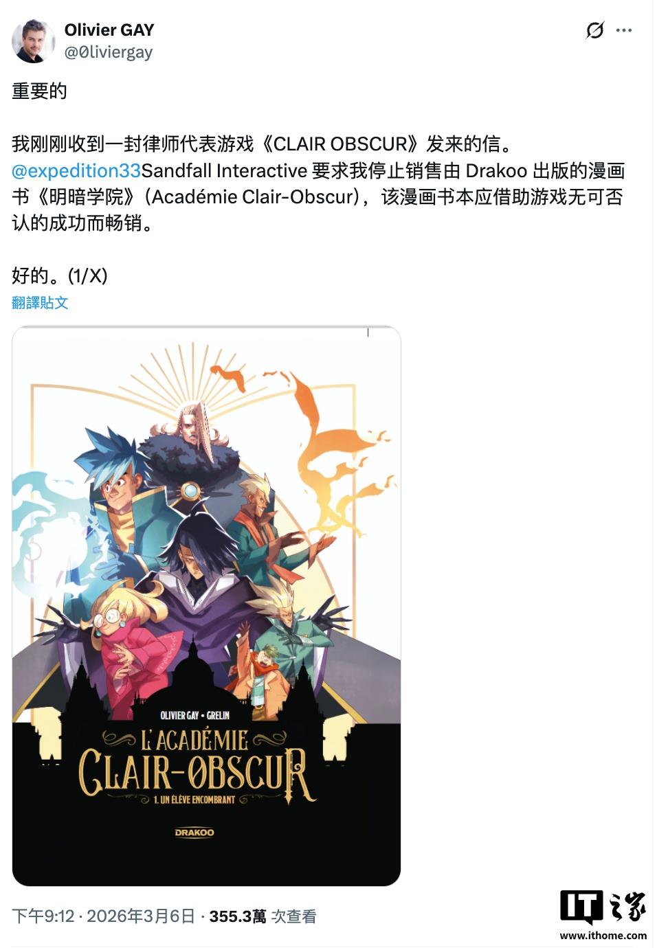法国漫画家 Olivier Gay 上周(3 月 6 日)在 X 平台发文称,自己收到了来自 Sandfall Interactive 的律师函,要求他下架《L'Académie Clair-Obscur》漫画,理由是该书的名字在“蹭游戏热度”。