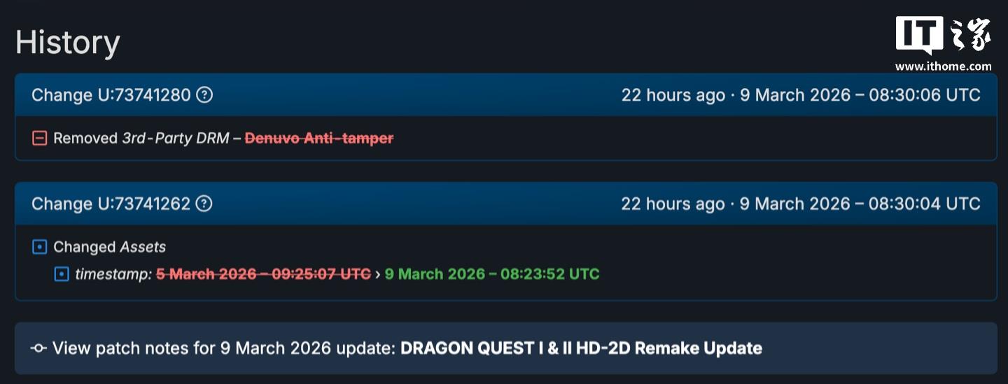 《勇者斗恶龙1&2 HD-2D重制版》迎来一个重磅更新。根据SteamDB的数据,SE在昨天推送的更新包里,把那个叫Denuvo的第三方防篡改组件,也就是大家常说的D加密,给移除了。这么一搞,游戏文件还瘦身了306MB。
