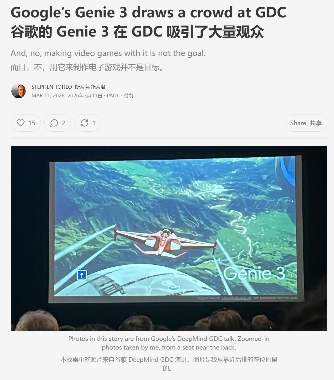 3月12号的消息,昨天游戏媒体GameFile发了个博客,提到谷歌在2026年游戏开发者大会上说了件事——他们那个Genie AI项目,眼下还没本事直接做出完整的游戏。