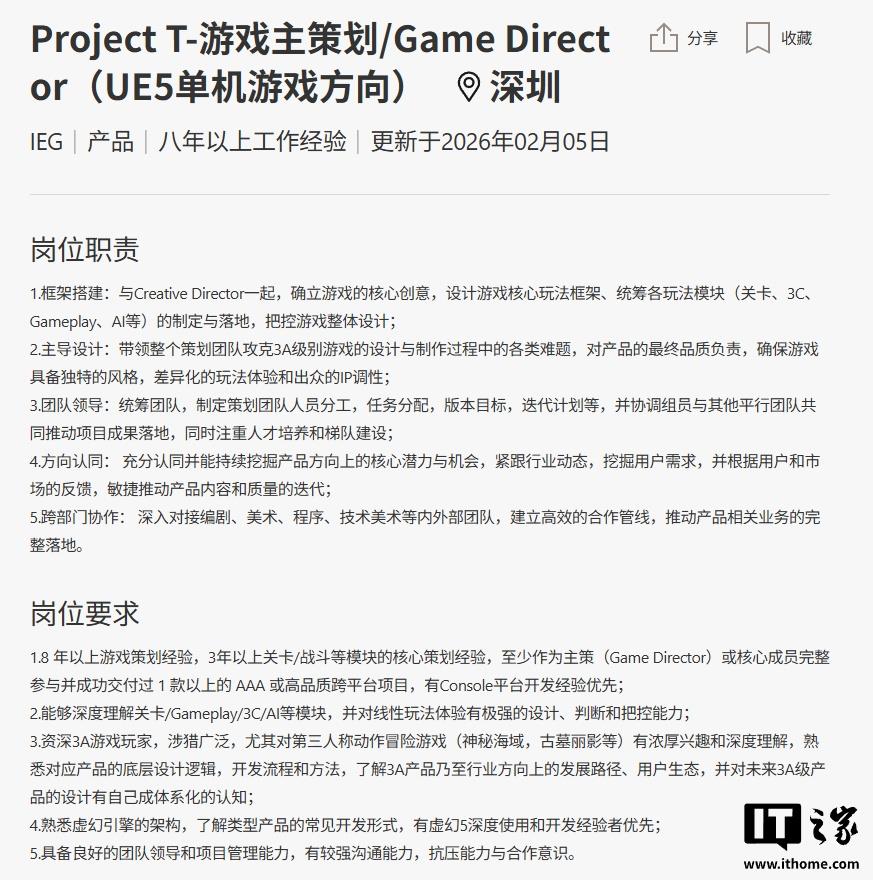该项目定位为 3A 级单机作品,将基于虚幻 5 引擎开发,核心类型为动作冒险类游戏,明确提到了《最后生还者》《神秘海域》《古墓丽影》等顶级 3A 作品。
