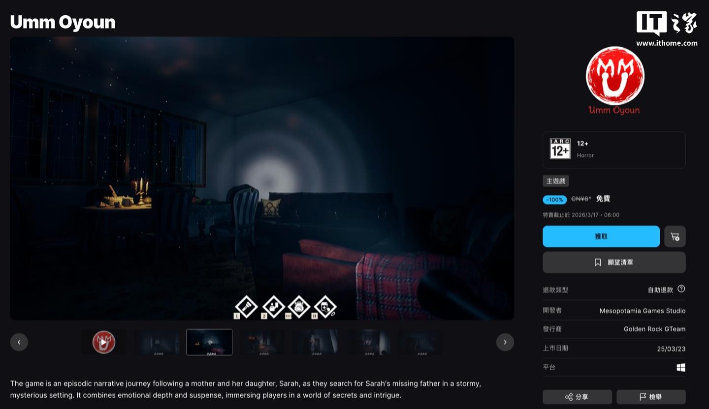 注意到:本次《Umm Oyoun》的限免并非平台官方活动,而是由开发者自行发起的特别促销。玩家可在 3 月 17 日前免费入库,目前游戏仅支持英语和阿拉伯语,游戏商品页(https://store.epicgames.com/zh-Hant/p/ummoyoun-a2aa02)。
