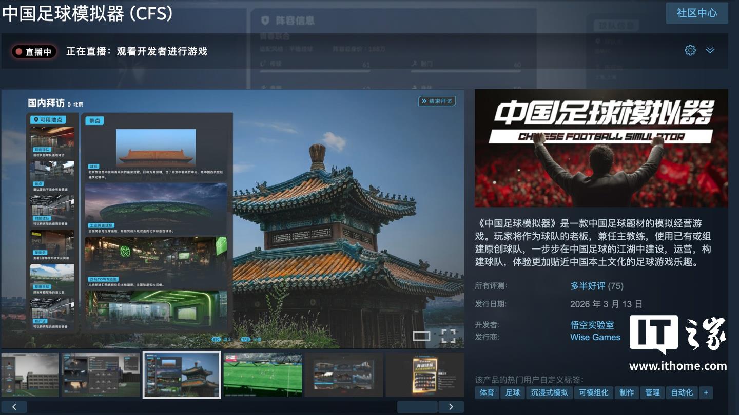 3月15日,《中国足球模拟器》上线Steam,国区售价38元,现在打9折,促销价34.2元,活动到3月23日结束。游戏目前评价为多半好评,感兴趣的朋友可以前往商店页了解:https://store.steampowered.com/app/3304320/_CFS/