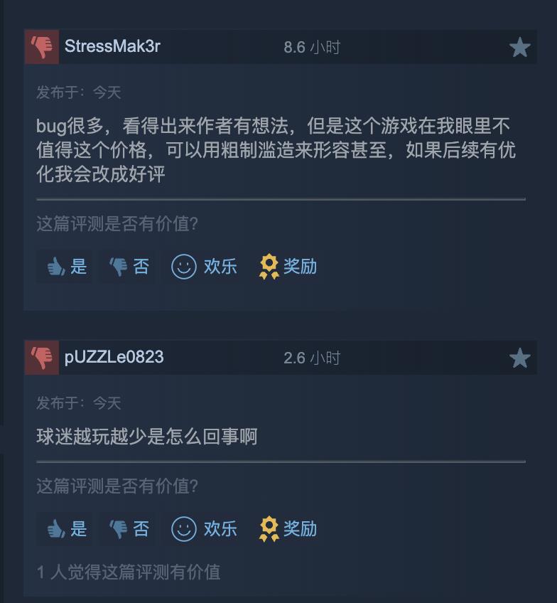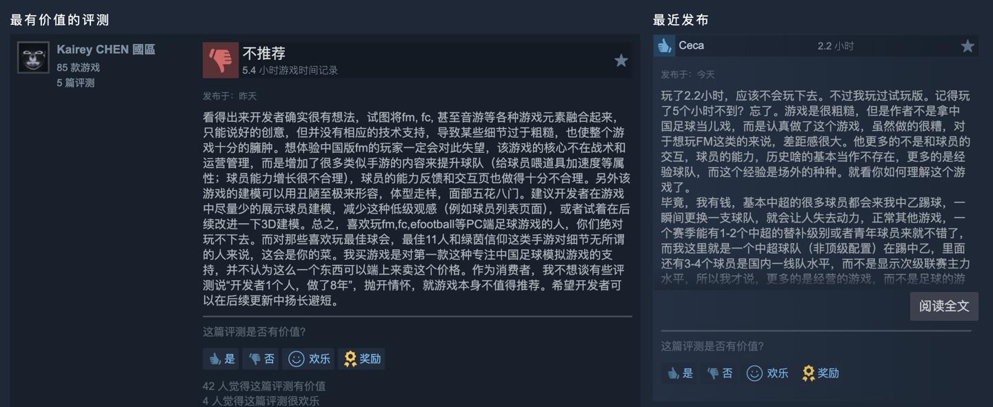 作为参考,本作由悟空实验室开发,峰值在线人数 897 人,玩家评测“多半好评”,差评玩家主要吐槽本作 Bug 太多、存档管理粗糙,球员的能力反馈和交互页较为不合理。
