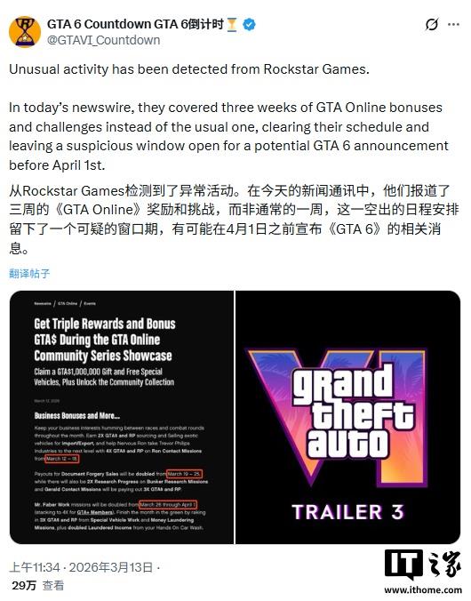 据了解,Rockstar 通常每篇新闻稿只公布一周的《 GTA Online》奖励内容,而 GTAVI_Countdown 发现,这篇博客直接放出了整整三周的奖励活动,时间从 3 月 12 日持续到 4 月 1 日。这种“一次性打包三倍内容”的操作,让一些人认为 Rockstar 是想先把这些内容一次性搞定,以便在不久后专心公布《GTA 6》的更新消息。