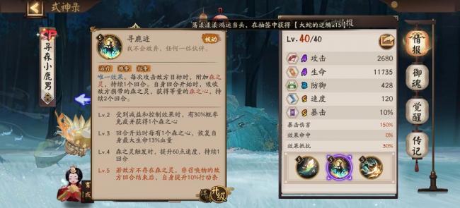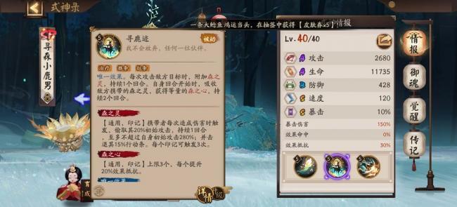 寻鹿迹是被动效果,并且是唯一效果。攻击敌方可以附加森之灵,自身行动前可以吸收敌方的森之灵并且获得等量的森之心,效果持续两个回合。技能等级提升后受到敌方减益和控制有概率获得一个森之心,每个森之心可以回复自己生命百分之十三的血量。森之灵触发可以提升一回合的速度,敌方没有森之灵提升自己的行动条。
