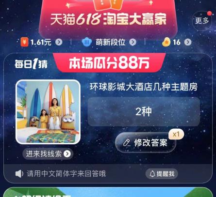 2、即可进入天猫618淘宝大赢家活动页面,每日都可参与答题。