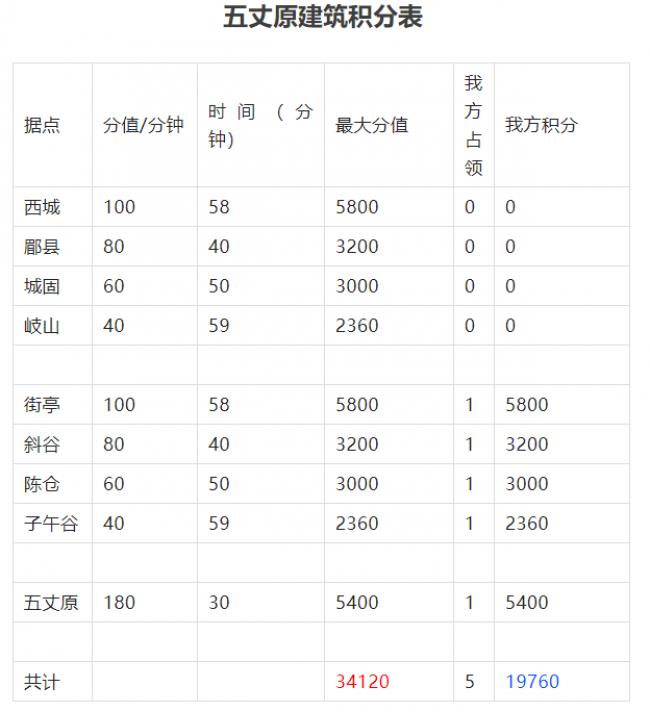 碾压局,我方两侧建筑全拿的话,最多获得34120分;相持局,我方只拿一侧建筑和五丈原的话,可获得19760分。当一方获得17060分以上时,该方本场已经获胜。