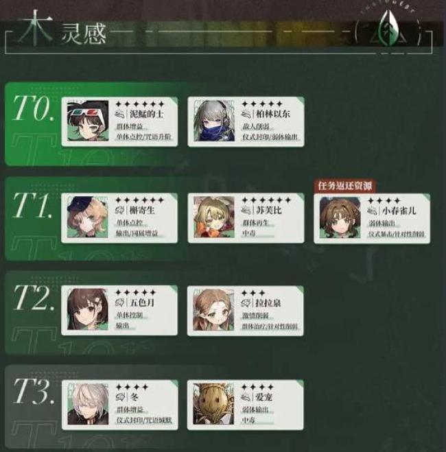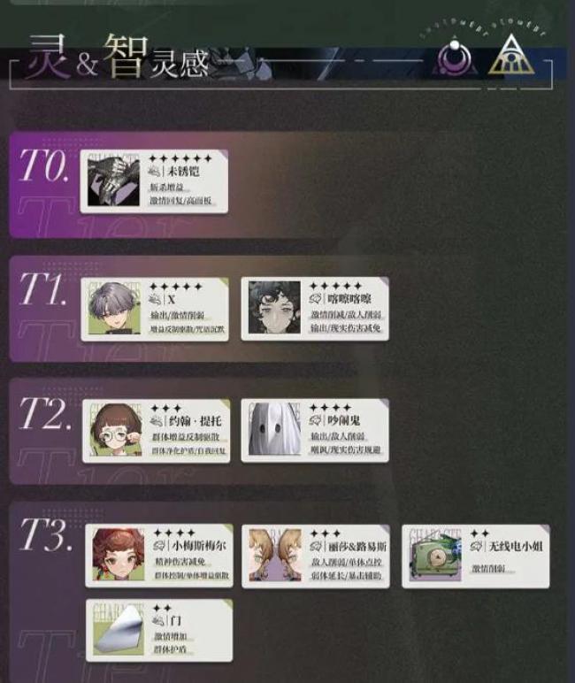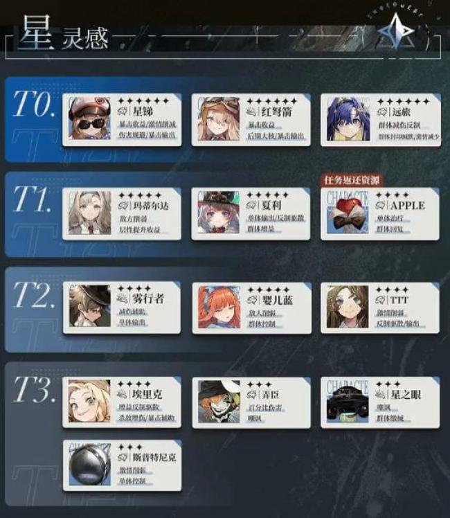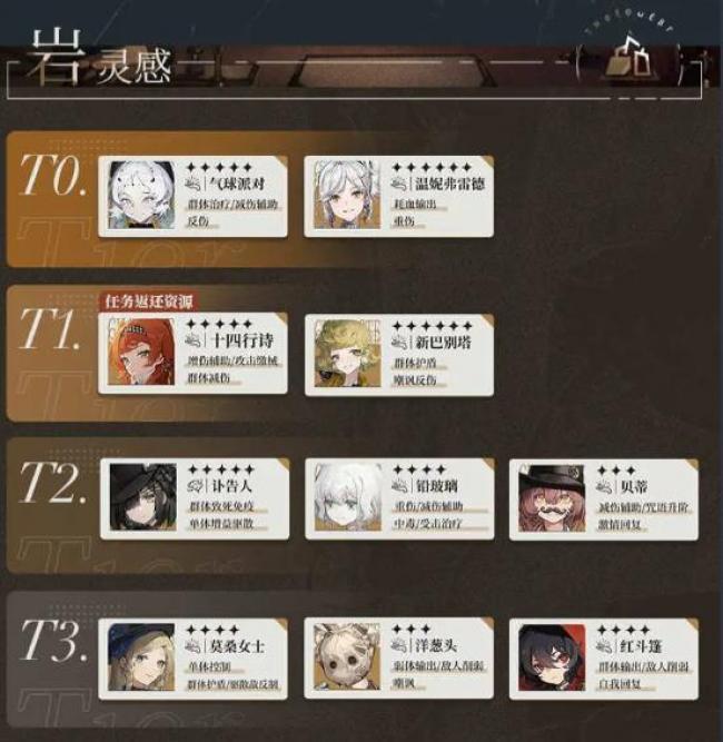 在当前的版本中,角色的实力可以根据以下分类进行评估和优先投入资源培养。但是仅供参考,其体的角色选择可以根据你个人喜好进行调整。 T0—这些角色在自身属性分类中表现出色。在培养优先级中,值得优先培养 T1—相比T0角色稍逊一筹,但仍然是非常出色的角色 T2—这些角色在特定的战略情况下具有一定的价值。尽管相对于T0和T1角色来说他们的实力稍逊一筹,但在特定场合中,他们能够发挥出独特的战术优势。如果您需要填补某些特殊需求,可以考虑投入资源培养这些角色 T3—暂不推荐培养的角色。这些角色在当前版本中的实力相对较弱,或者在大部分情况下无法与其他角色媲美。因此,即使某些角色在一些特殊场合有功能,但暂时不建议投入过多资源进行培养。