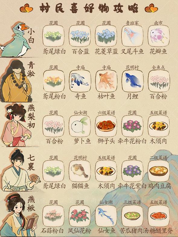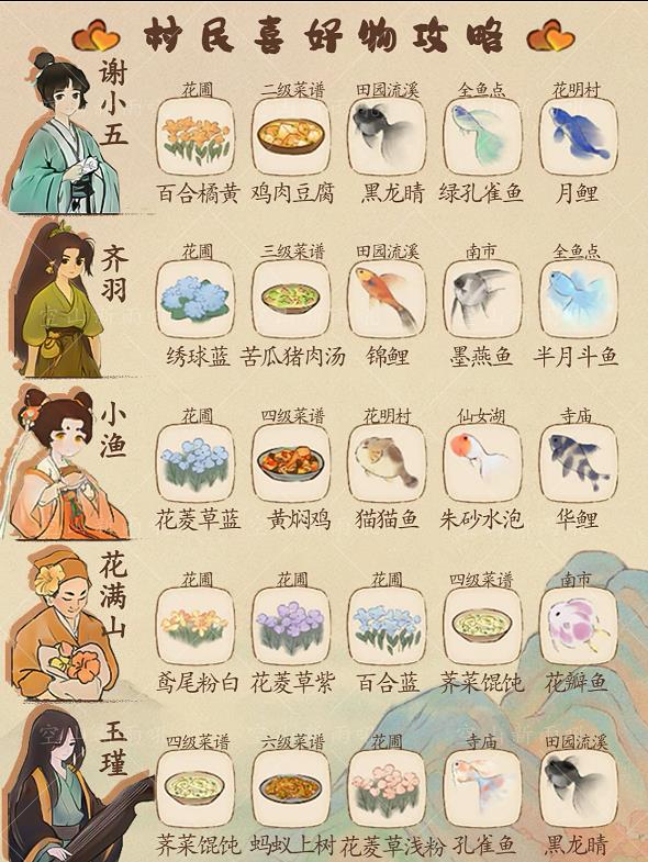 桃源这款治愈轻松的经营游戏中,每位村民都有自己独特的个性,玩家可以通过与他们互动,送上他们喜欢的物品来提升好感度,解锁更多资源。小编为你整理了村民们的喜好清单,赶紧了解一下吧。