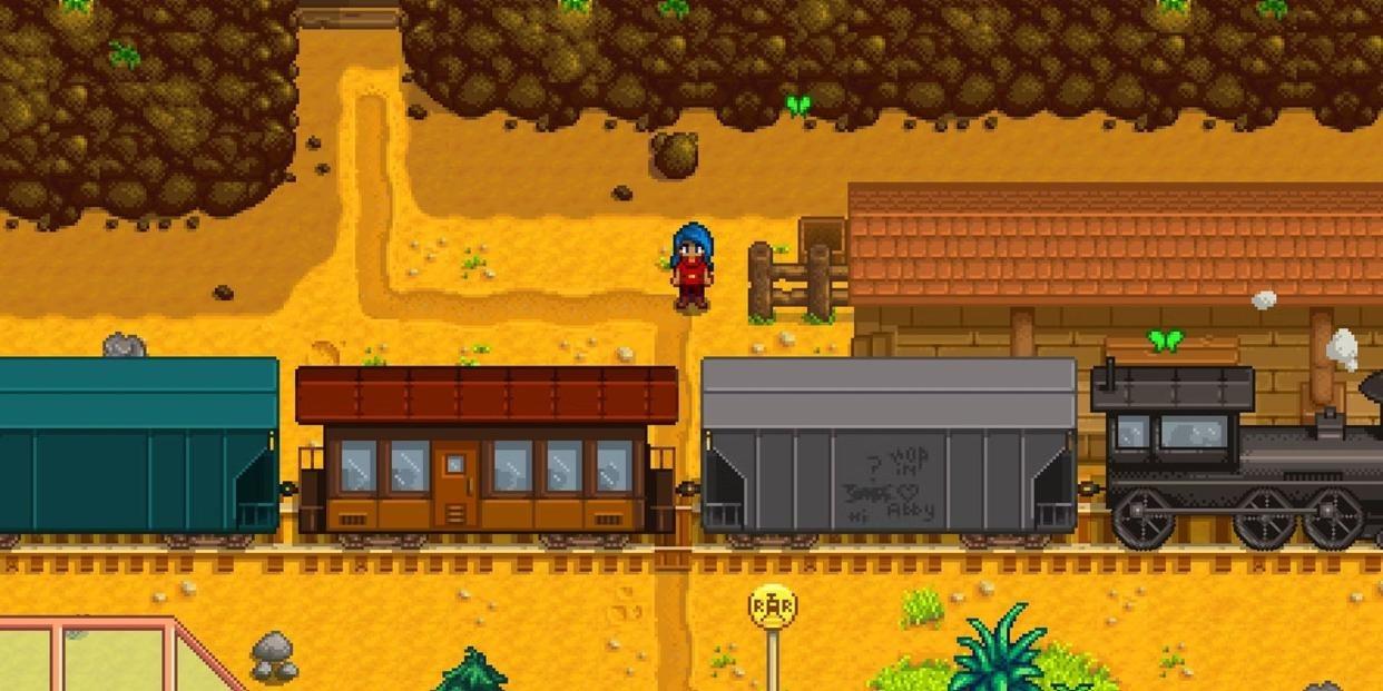 夏季随机地震后解锁火车事件,火车只出现在地图最北端铁轨(温泉附近)。每天 9:00–18:00 随机出现,夏、冬季更多;出现时会有文字提示 汽笛,必须在场才会掉东西。