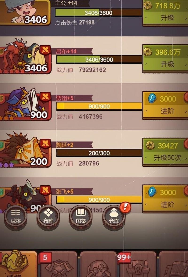 前期只需专注提升吕布的等级和进阶,其余随从达到900级后无需再进阶。以角色等级3500为例,主公每升一级需消耗718.8万金币,而每日挂机获取的金币(通关5500关)总量不足1亿,仅用于主公升级都显得捉襟见肘,资源压力极大。