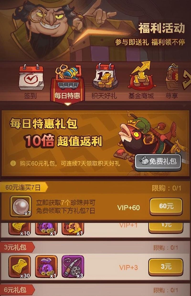只需花费60元,这款礼包性价比很高,可立即获得7颗珍珠,并连续七天每天领取5个金币礼包及额外资源,非常适合前期玩家入手,助力快速成长。