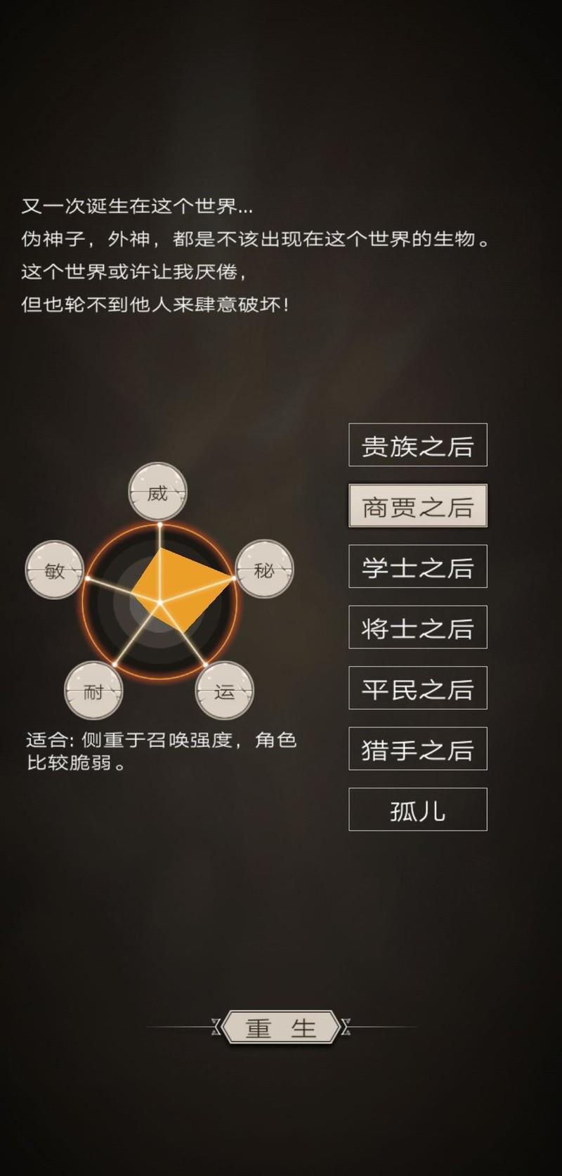 商贾这个职业,大家有没有读错成贾(jiǎ)?读错了就该打自己一下。这个身份与贵族截然对立,就像现实中权力与财富的互相轻视一样,游戏中也是如此。贵族彻底放弃召唤能力,而商贾则专注于召唤,堪称前期和中期极为强势的职业之一,因此非常适合作为新手首选。召唤单位在游戏前中期表现突出,能轻松应对多数战斗。不过到了后期,商贾会显得有些乏力,防御薄弱的问题逐渐暴露。虽然可以转职为学士来增强自身,但即便重生为学士,依然难以摆脱生存能力差的短板。尤其面对擅长技能输出或群体魔法打击的职业时,召唤物可能扛得住几轮,但本体往往会被迅速击溃,承受巨大压力。