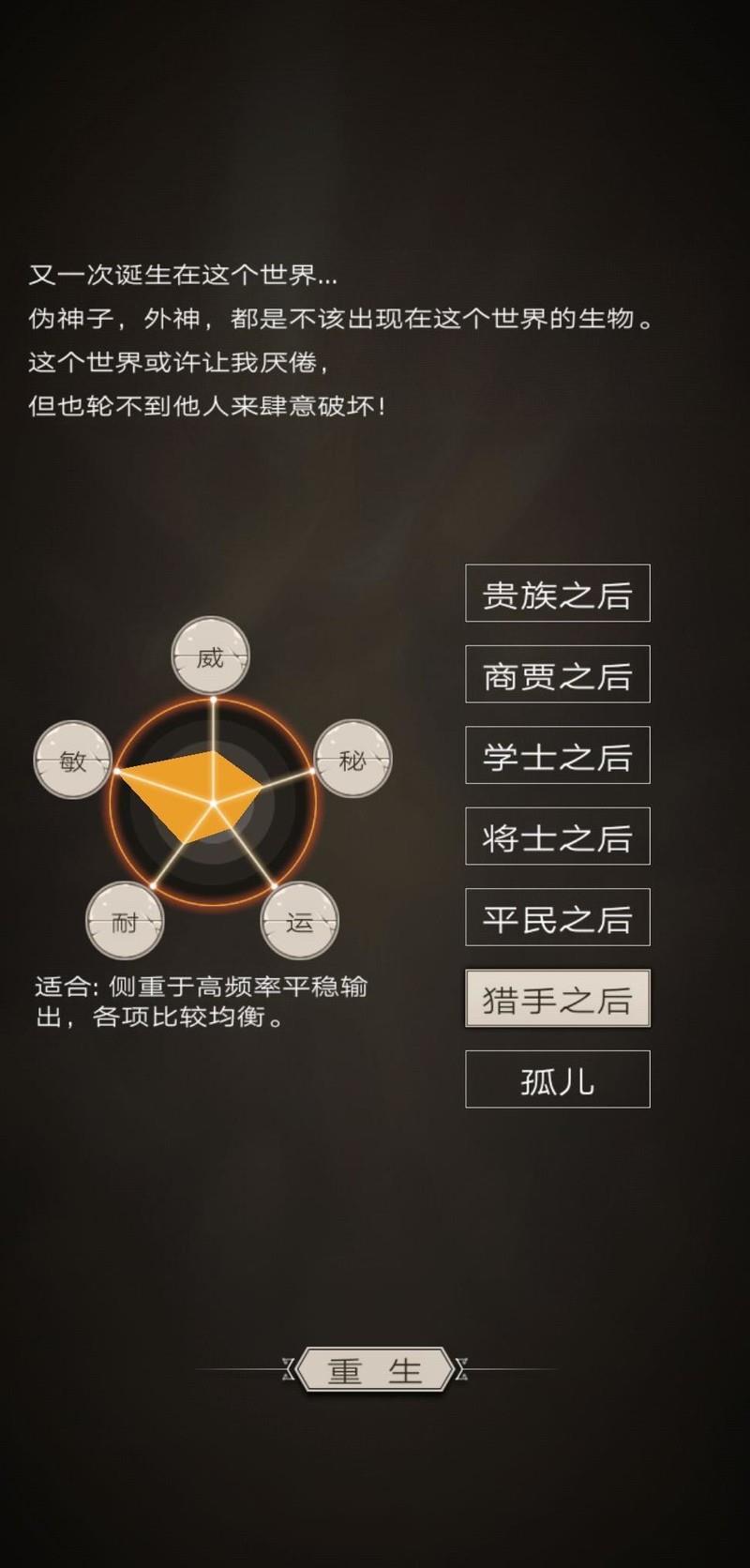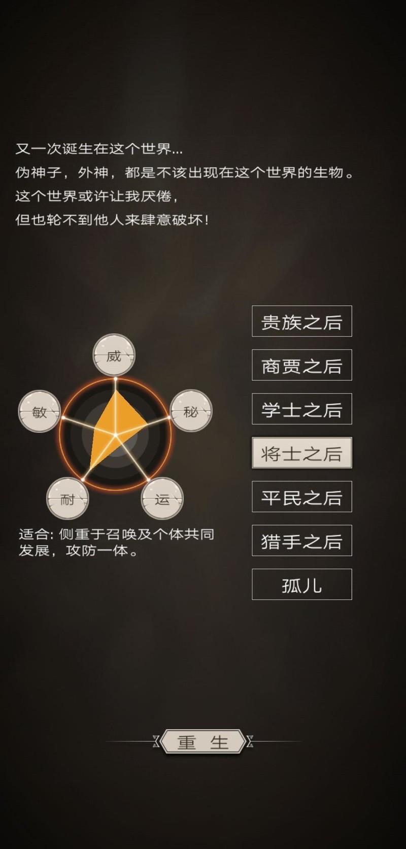 出身贵族的角色放弃了召唤类天赋后,其余属性发展较为均衡,攻防能力中庸,理论上应是攻守兼备的战士类型。然而现实中坚持走贵族路线走到最后的玩家极少,甚至不如基础属性最弱的孤儿职业常见。究其原因,可能是贵族缺乏突出优势,特性不够鲜明,导致在确定发展方向后,多数人选择重生为契合流派需求的属性组合,因而鲜少有人保留贵族身份。虽然如此,若能一路坚持不重生,后期脱离召唤系后,或许能自由转职为其他职业,发展潜力不容小觑。
