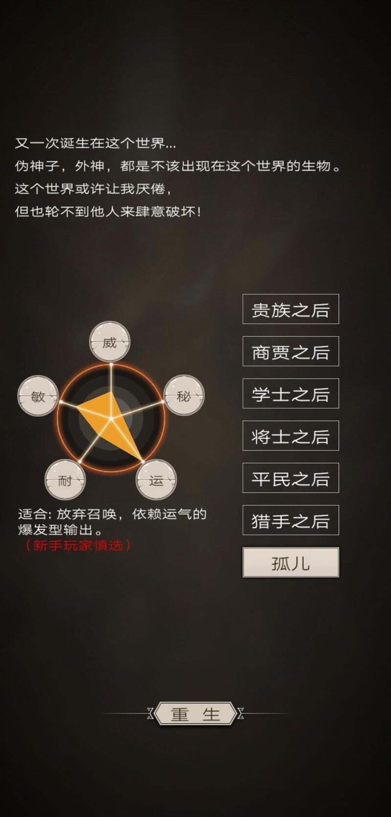 孤儿是官方唯一标注为红色的大神级职业,被众多顶尖玩家奉为信仰般的存在。然而现实却是,新手选择平民职业反而更具优势,不仅运气同样出色,生存能力也更高。尽管如此,这个职业仍如同游戏中的亚索或AWM一般,象征着一种情怀与执着。真正吸引大神的并非实际收益,而是那个名字以及下方醒目的红色标识所带来的独特魅力。听起来或许有些中二,但事实的确如此。孤儿的基础属性并不理想,操作难度极高,即便是老玩家也常感棘手。其依赖的高运属性所提升的暴击与格挡数值微乎其微,远不如一件普通强力词条来得实用。