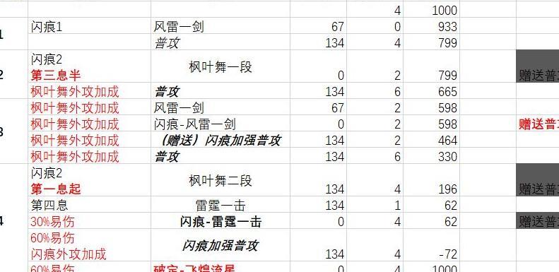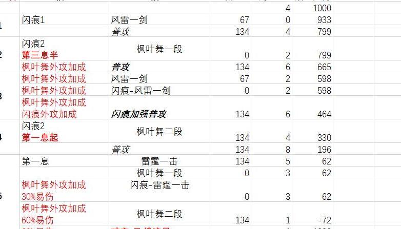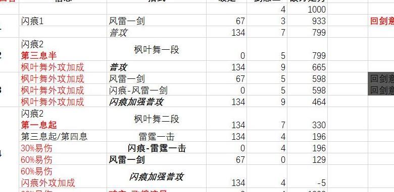 最后是风雷回剑意配合普攻的连招,与仅靠普攻回剑意的打法类似,区别在于用风雷替代普攻进行破定。不过破定时间提升并不显著:若第三回合两次风雷仅积累两格资源,则第四回合第二息可释放双雷霆,待第三息风雷冷却后再出手。表格存在误差,建议大家自行实战测试验证,灵活调整节奏以获得最佳效果。