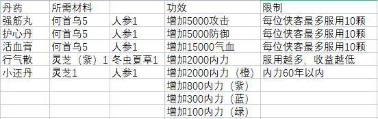 有三类提升属性的丹药,所需材料相同。建议优先炼制十颗强筋丹以增强攻击力,当主输出角色无法服用时,再考虑炼制气血与防御类丹药。