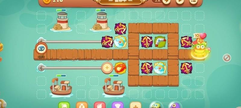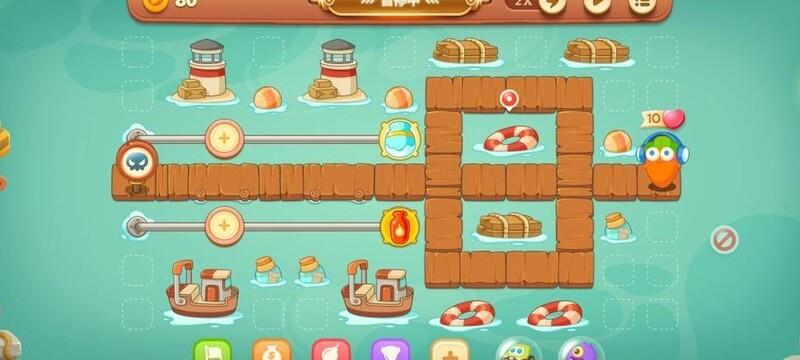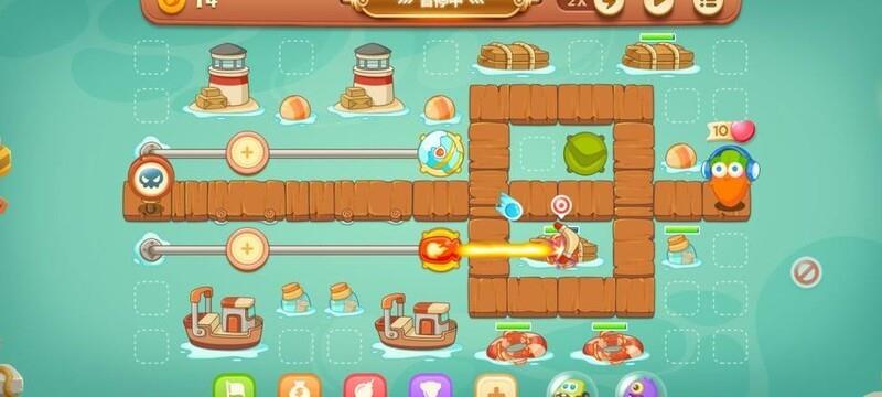 清理完游泳圈后放置回力标,瞄准下方障碍物攻击,边打边升级,注意清除小怪,位置不宜过深。