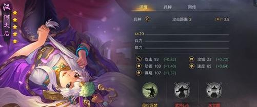 三维成长方面,武力为0.82,虽略显一般,但影响有限;谋略成长达1.37,作为容易获取的武将而言尚属合格。速度与防御处于中等水平,整体属性较为均衡。其自带战法母仪浮梦在战斗开始时生效,可使我军群体首次受到攻击时进入规避状态,完全免疫该次伤害。同时,在前四回合内,敌方全体每次发动普通攻击或策略攻击时,均有50%概率使本次攻击造成的伤害最多降低30%,减伤效果受自身谋略属性影响,具备较强的辅助与干扰能力。