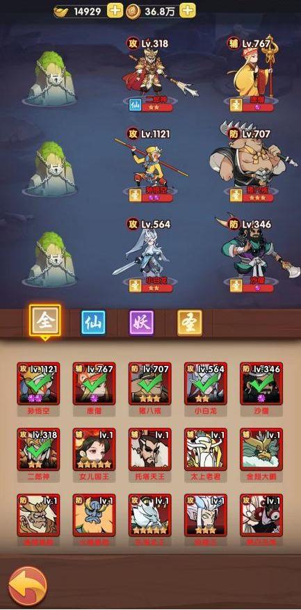除了大家熟知的西行阵容,还有二郎神、托塔李天王、金翅大鹏等经典角色。每位仙灵都拥有专属技能,部分角色之间还存在独特的组合效果,考验玩家的策略搭配。