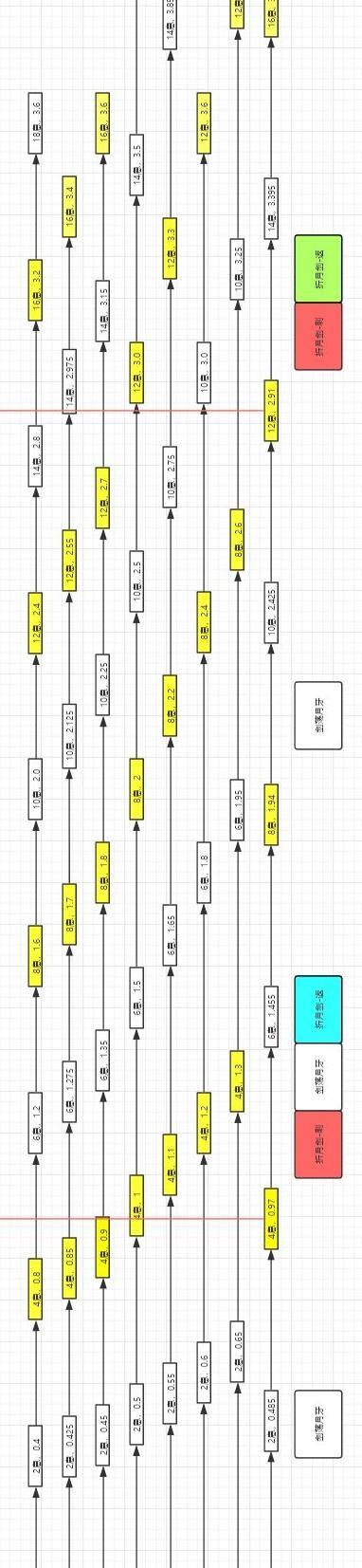 红线表示折月剑刺技能可在该时间点释放,黄线代表普通攻击动作。不同颜色用于帮助玩家对照连招流程图。数字为时间节点(单位:秒),武器后数字为其初始重量。