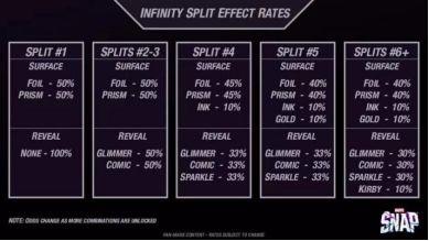 获得卡牌及其变体后,可以使用蓝点和粒子进行升级,当升级达到上限后,便可进行一次卡牌分裂。分裂会为卡牌增添全新的背景与粒子特效。背景特效共有四种类型:闪箔、棱镜、墨色和炫金;粒子特效也分为四类:格调、微光、星尘和爆裂。每种粒子特效还可选择八种颜色:黑、彩虹、金、紫、红、蓝、白、绿。不同类型的背景与粒子特效均有各自对应的分裂概率。