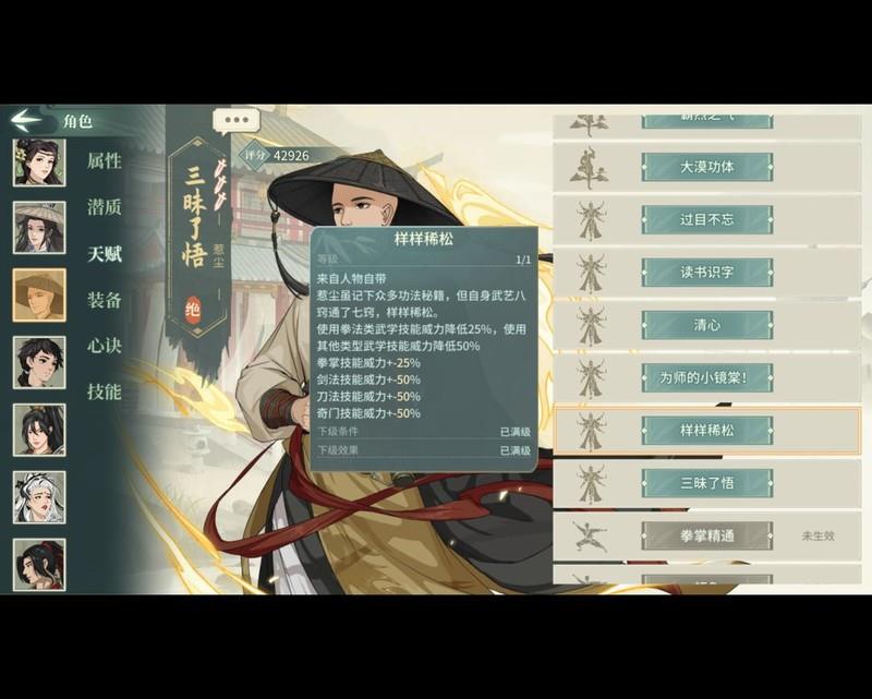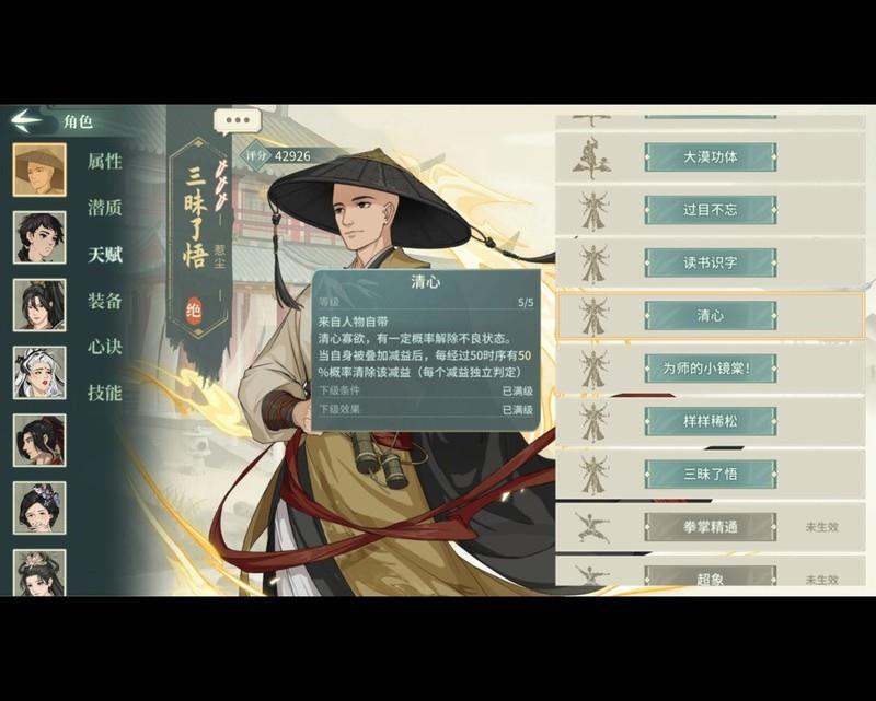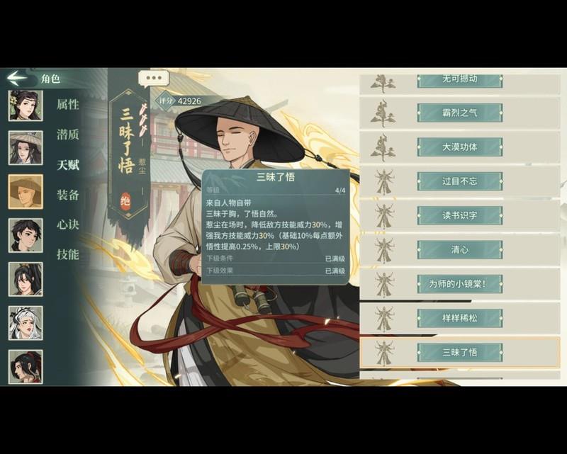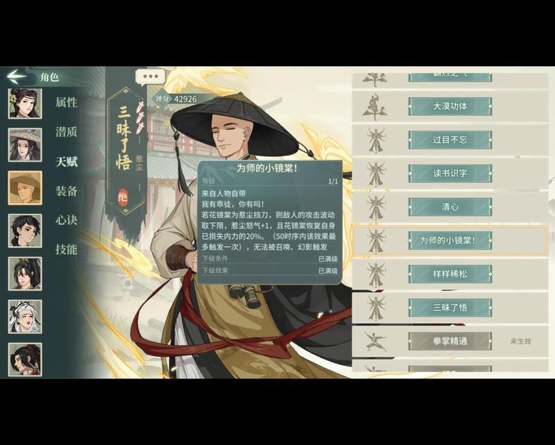 老和尚天赋平庸,各项能力都不突出,尤其在武学技能威力上还被削弱,显然是策划有意为之,使其只能担任辅助角色。