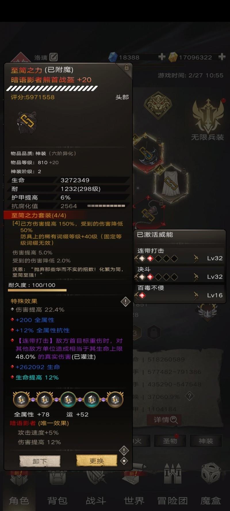 神装前用头盔过渡,优先选择耐久和生命增伤属性,替换掉神器词条,腐化属性可提升生命值。