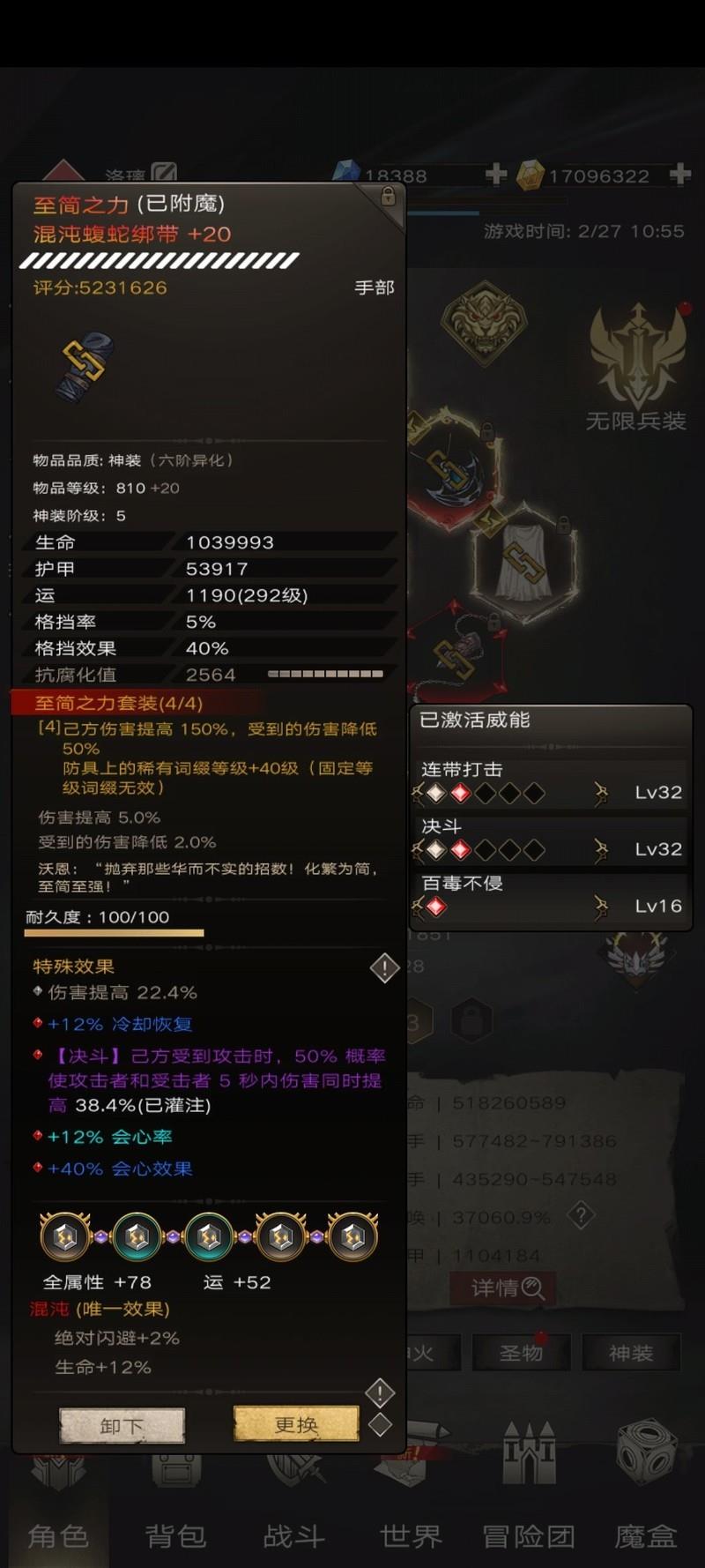 至简之力四件套效果:以血换命、深渊凝视、以静制动、武器附魔灵魂收束(使混沌伤害享受平均属性加成)。需注意深渊凝视基于面板生命值,战斗中改变生命值的效果如镜面反射词缀对锁链无效。