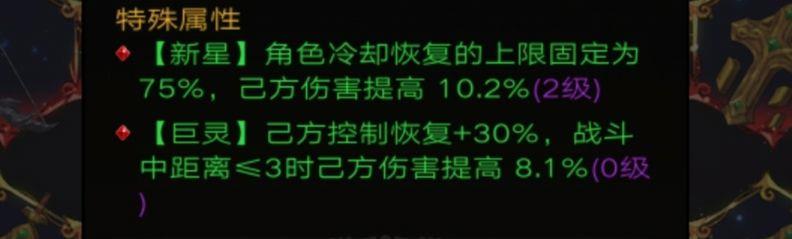 随机属性以通用增伤为主,也可包含一条属性增伤或暴击增伤。特殊属性选择星云,搭配巨灵或怜月。若使用巨灵,注意攻击距离会变为3格以内。