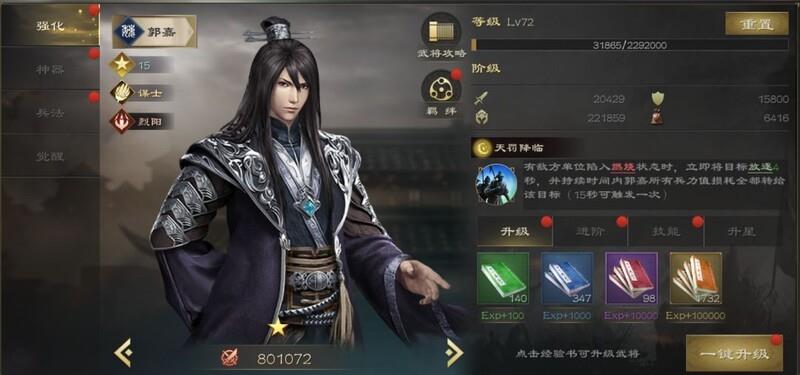 郭嘉的「天王十连击」与「运筹帷幄」技能,不仅大幅增强自身攻击力,还能对敌方全体造成高额伤害,并为我方武将回复怒气,是位相当出色的辅助型武将。